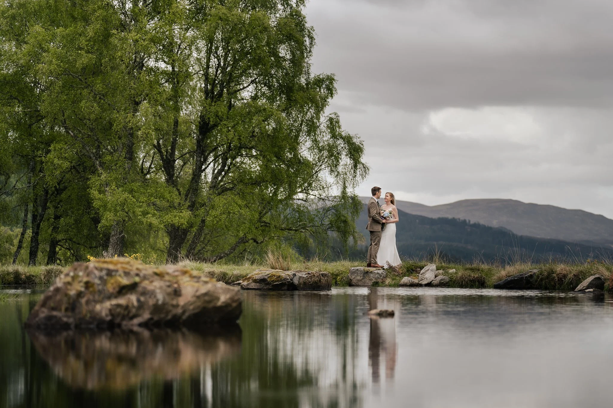 This super-chilled intimate wedding in the idyllic Scottish Highlands with the most joyous of couples is giving us all the feels! Having met in the first week of uni, Jess and Josh were besties from the beginning before things got more romantic. Ten years later, Josh booked a surprise holiday for Jess’s birthday: a log cabin in the Highlands of Scotland. As Jess puts it, it was “out of this world”, and it was on a beautiful glen with nobody around (except their adorable dog) that Josh proposed. It was gorgeously sunny and warm, despite being March and, well, the Highlands (!), and they loved the whole setting so much that they decided to return there and get married a year later. When they discovered that the same cabin was available, even though the cabins usually got booked up months in advance, they felt it was meant to be, and got married on its decking. The cabin is so special to both of them that its co-ordinates are engraved on both Jess’s engagement ring and both of their wedding bands. Keen to not have anything big or showy, the only guests were the registrar, Jess’s Mum and Dad, and two dogs – and the occasional deer made an appearance!